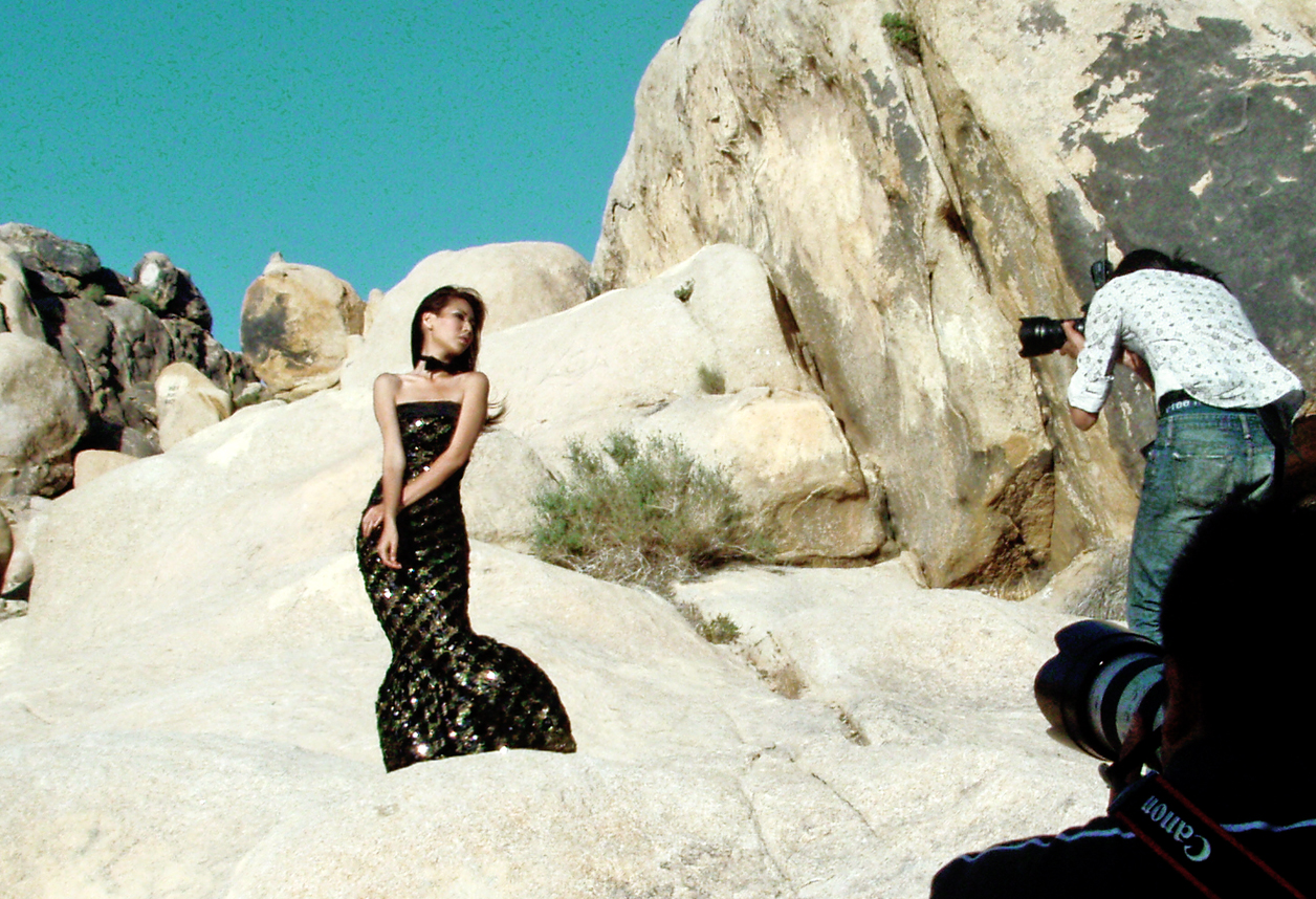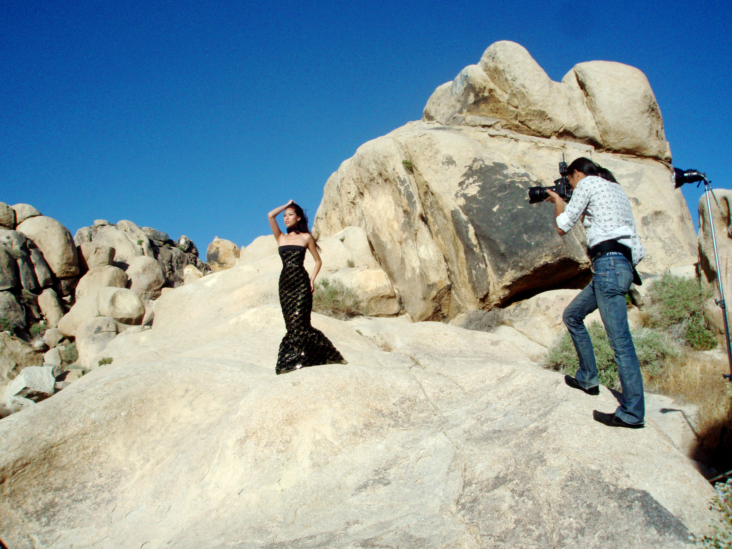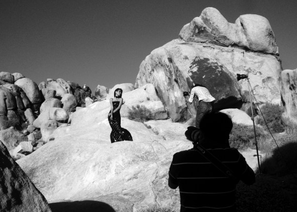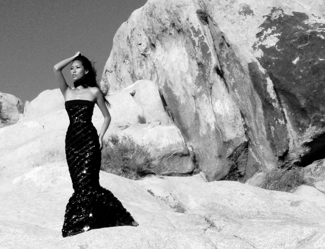 Yesterday I worked with ModXChange as a featured designer/brand- with a photo and video shoot out in the Mojave desert. And while the desert is one of my absolute favorite locations– I could have done without the severe wind and sandstorms. I’m actually surprised these behind-the-scenes snapshots are in focus- standing still was nearly impossible! We shot at this amazing rock formation (with photographer Nathan Le), and the dress pictured is the “Vera”- my newest obsession: full length sequined mermaid gown. Enjoy. Results to come soon. – LE