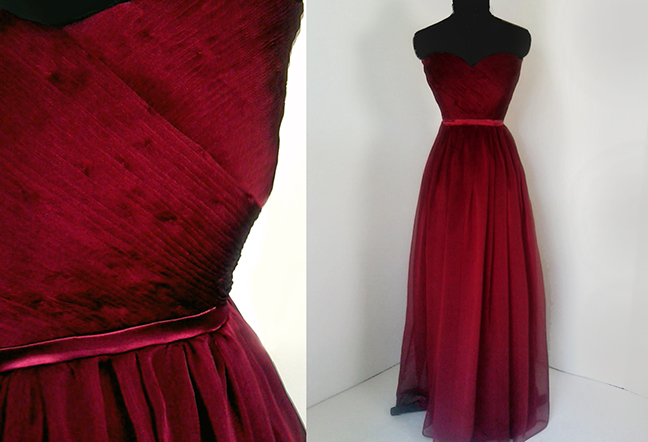 Because it’s Prom Season, and we’ve never featured a custom Prom gown in our “Epilogue” section, I thought I’d share this scarlet, sweetheart creation we did for one of my favorite customers–my cousin Mary Chandler in Grayson, Georgia. Last year I worked with Mary Chandler to design a soft, silvery gray Prom gown, with beading and ruffle detailing. This year, she wanted something somewhat simpler but no less beautiful. I love the delicate, sophisticated look of this gown. It features wrap-around rouching on the bodice, a thin satin waist band, and flared a-line skirt of two-tone silk chiffon. And I love Mary Chandler’s decision to complete the look with a soft floral crown. Styling perfection.