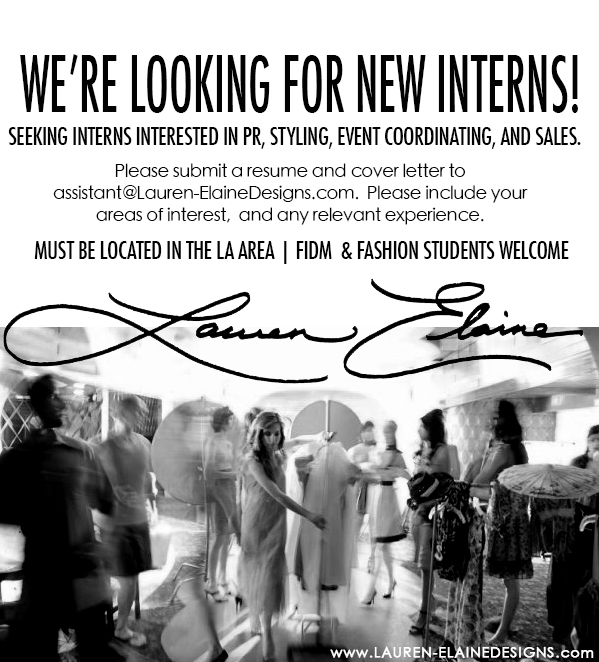 We’re looking for new interns to join our team! If you’re interested in Fashion PR, Styling, Celebrity Relations, Event Coordinating, or Sales, please contact us! Submit your resume and a quick cover letter to assistant@Lauren-ElaineDesigns.com. Please let us know about your related experience and areas of interest. FIDM & Fashion School students welcome. LA-area interns only please.