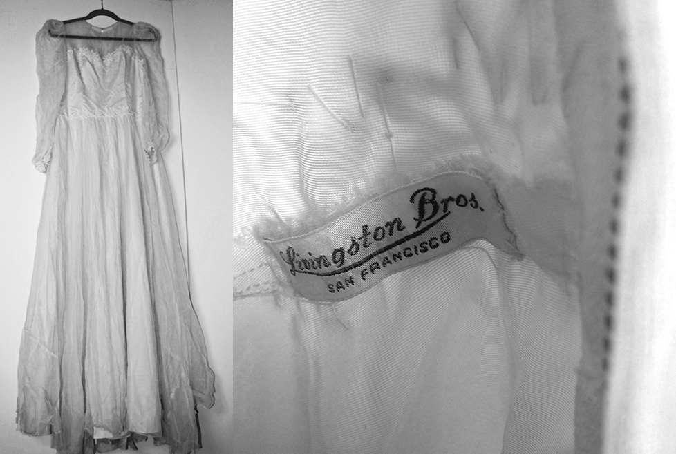 This fall I had the honor of designing my new sister-in-law’s bridal gown for her October 12th wedding in Morro Bay, California (pics and post coming soon!) During one of her fittings, she mentioned that she wanted to incorporate material and lace from her grandmother’s 1930s vintage wedding gown into her ensemble. She asked if I had any ideas? While we originally brainstormed a one-of-kind heirloom garter, after seeing the gown for the first time, I suggested a restoration project to create a very special rehearsal dress from her grandmothers vintage gown. The inspiration was something bohemian, feminine, and appropriate for her seaside venue and semi-casual rehearsal dinner. The entire new dress is made solely from the materials and fabric of her grandmother’s gown. Here’s a look at the before and after: