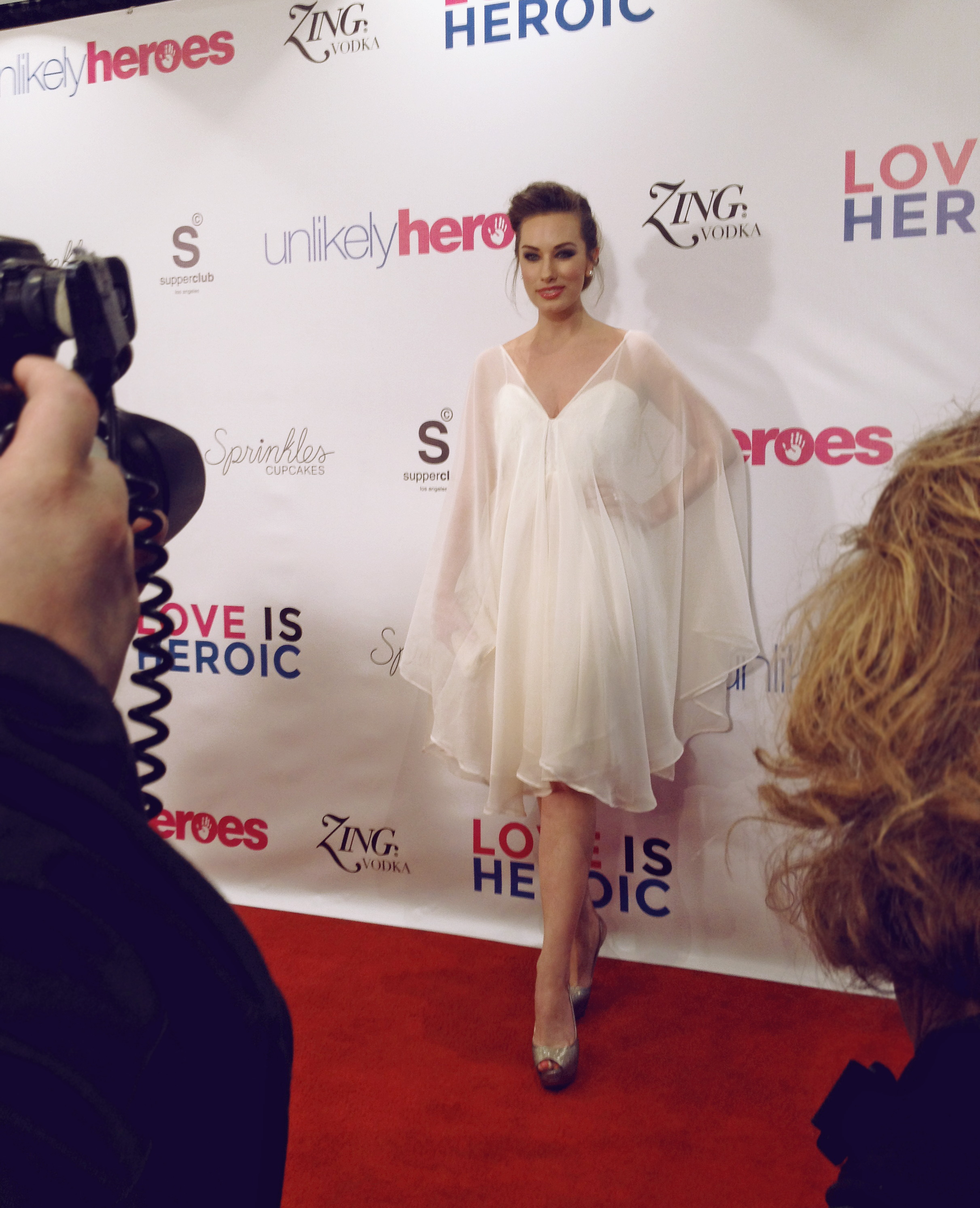 In late March I had the pleasure of attending another wonderful Unlikely Heroes benefit event – ‘Love is Heroic’. I’m a big supporter of Unlikely Heroes and their tremendous work to rescue and provide homes for victims of sex slavery around the world. The Love is Heroic benefit took place at Supperclub in Hollywood, and featured performances by the hillarious Anjelah Johnson and singer Andra Day. For the event, I went for a soft angelic look. I’d been waiting for the chance to wear the new “Astra” Capelet Dress from my new bridal collection. While it’s from the bridal collection, I wore it in Softest Champagne, which lessened it’s ‘bridal’ feel, especially when paired with shimmery gold heels and jewelry. While I’m definitely biased, I’m absolutely in love with this dress! The chiffon cape layer makes it so much fun to wear, and the dramatic low cut back definitely makes a statement.
