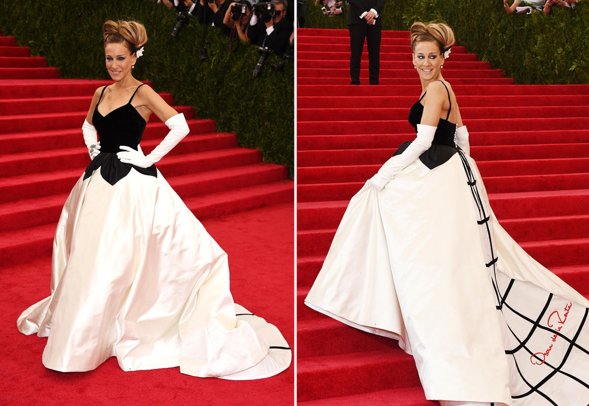 Sure, it’s over-the-top, but it’s the MET BALL. Given this year’s theme, it’s absolutely perfect.   And only SJP could pull off this decadent Oscar de la Renta creation, complete with a red John Hancock.