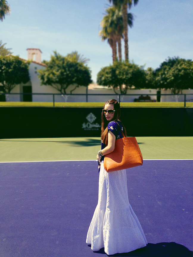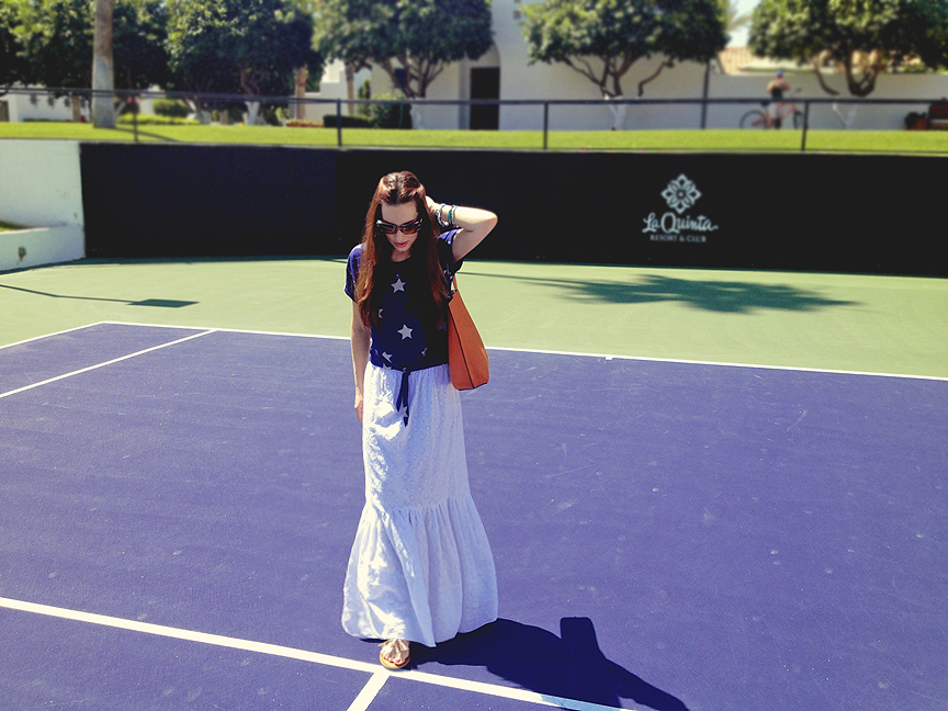 Memorial Day marks the unofficial start of summer, and the time when one of my  favorite color trios starts popping up everywhere.  While I love a good mix of red, white, and blue, I also love to change things up.  During my recent creative retreat in Palm Springs,  I decided to get a head start on a patriotic summer look by pairing the new “Praireigh” Maxi from Laine by Lauren Collection with a starry navy top, and substituting the classic red with a pop of bright orange. Swapping orange for red, or even teal for navy, is a great way to channel your inner ‘American girl’ without looking like a flag.  Shop Praireigh HERE.