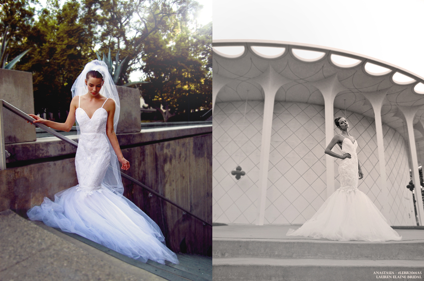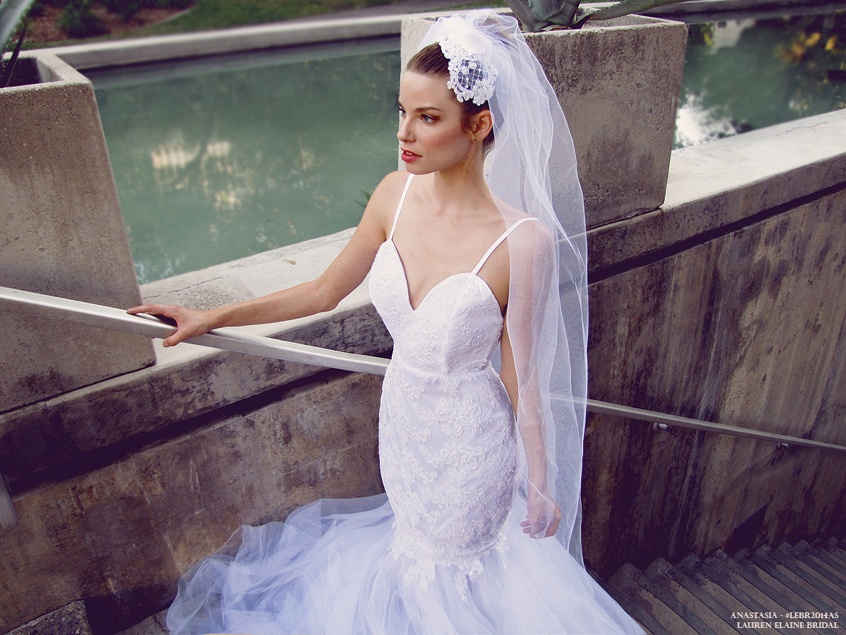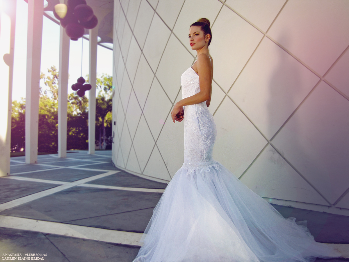 Enthrall in this show-stopping mermaid gown of pearl beaded lace and feathered tulle with a dramatic open back silhouette. SHOP ANASTASIA here.