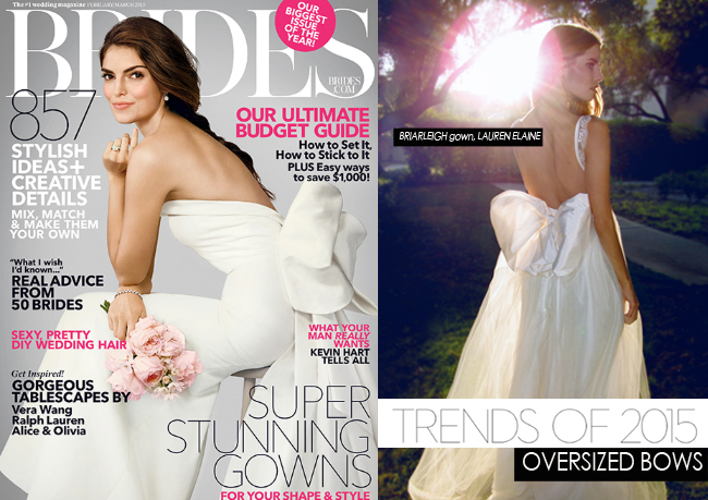 Today’s trend: Oversize Bows. As seen on the cover and inside the current issue of Brides Magazine, oversized bows are having a moment. Not only do they add a punch of unexpected drama with the right placement, but if you select a gown featuring a self-tying bow, like the Lauren Elaine Briarleigh, you can create the shape and look you prefer –from big and voluminous to loose and draped.