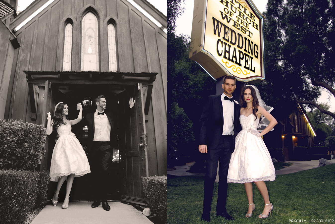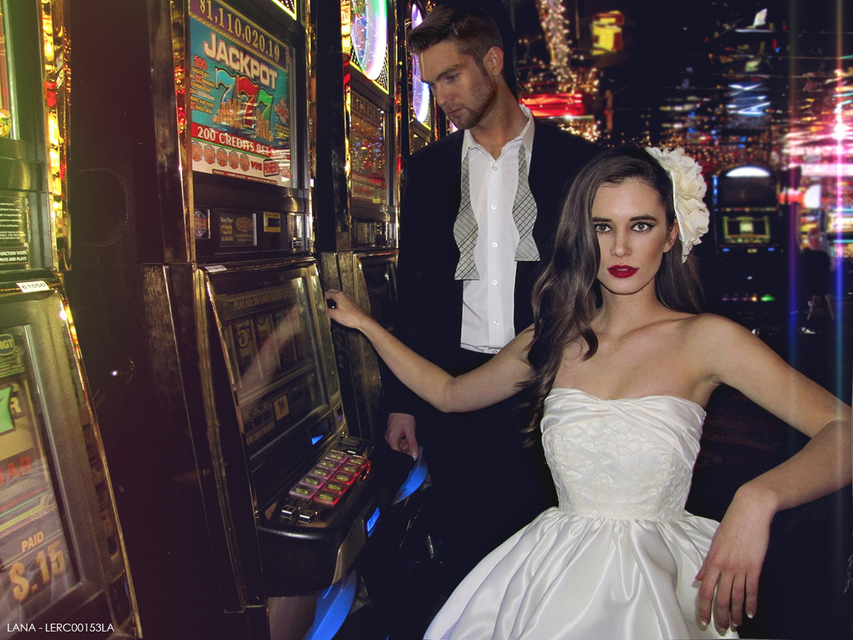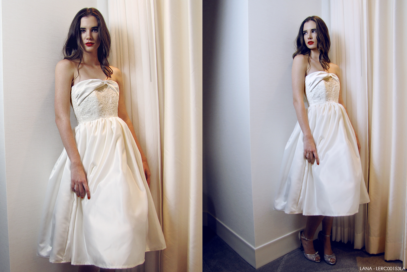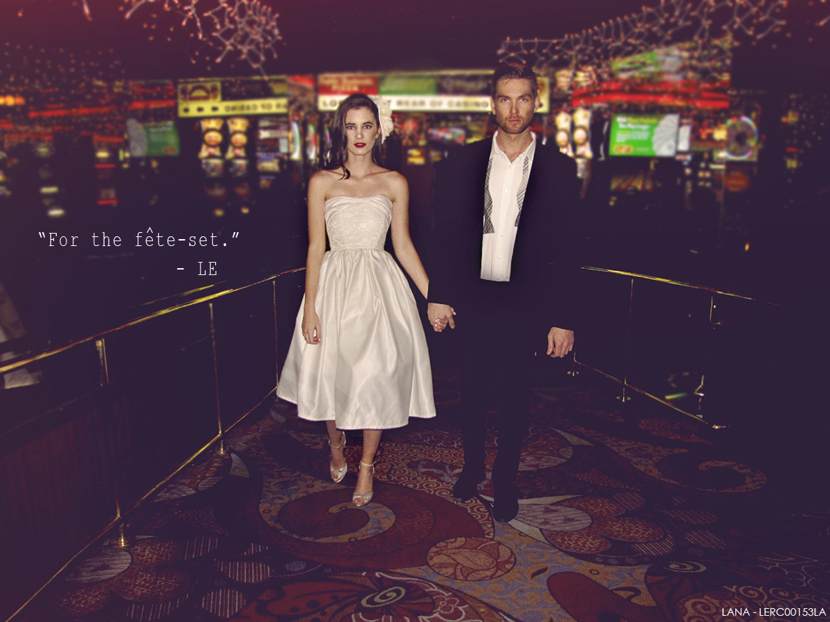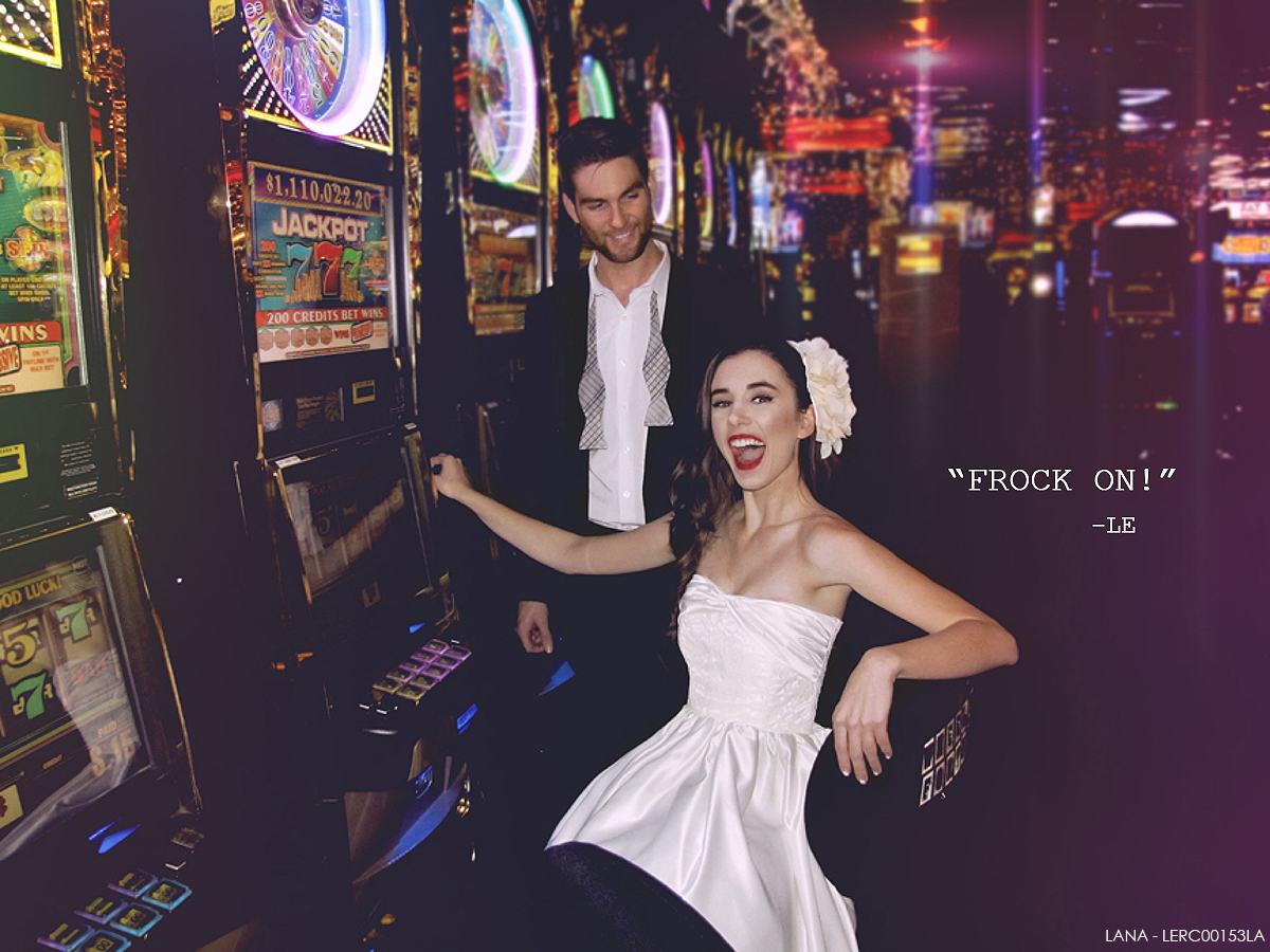 FROCK ON!  Presenting the inaugural lookbook for the Reception Collection by Lauren Elaine Bridal! Curated especially for destination weddings, elopements, wedding receptions and rehearsals, the Reception Collection offers a variety of fete-worthy retro-feel frocks in tea length silhouettes and unique fabrications, including Ombre tulle and 3-D lace flowers.  To highlight the Reception Collection’s fun and retro mood, we headed to the bright lights of Las Vegas, NV.  View the behind-the-scenes video from the shoot here.  And shop all of the styles from the ‘Reception Collection’ at Lauren-ElaineDesigns.com.