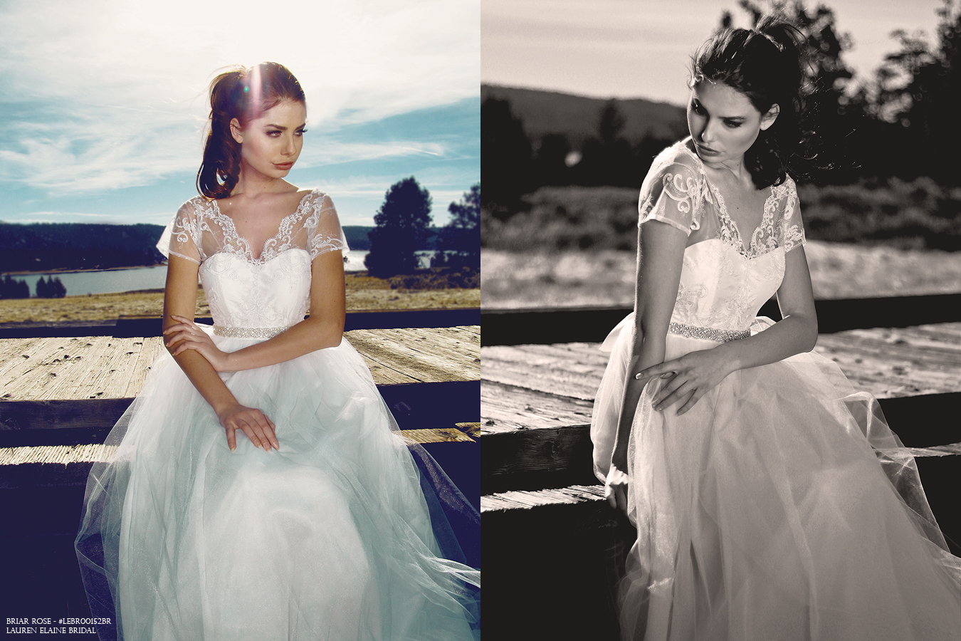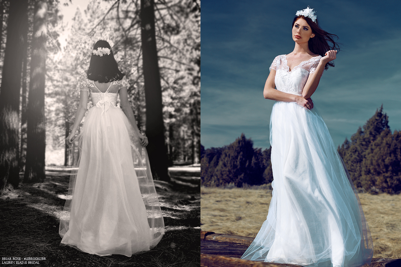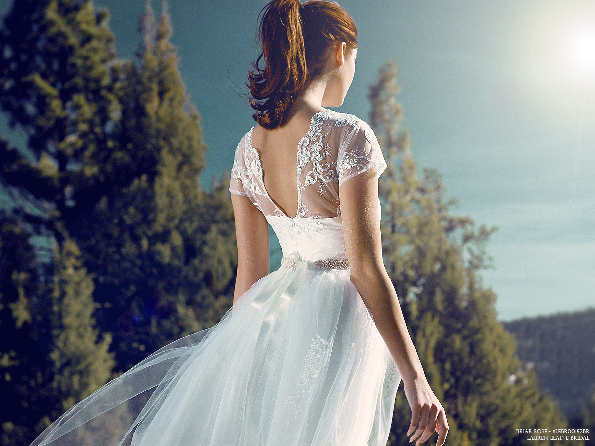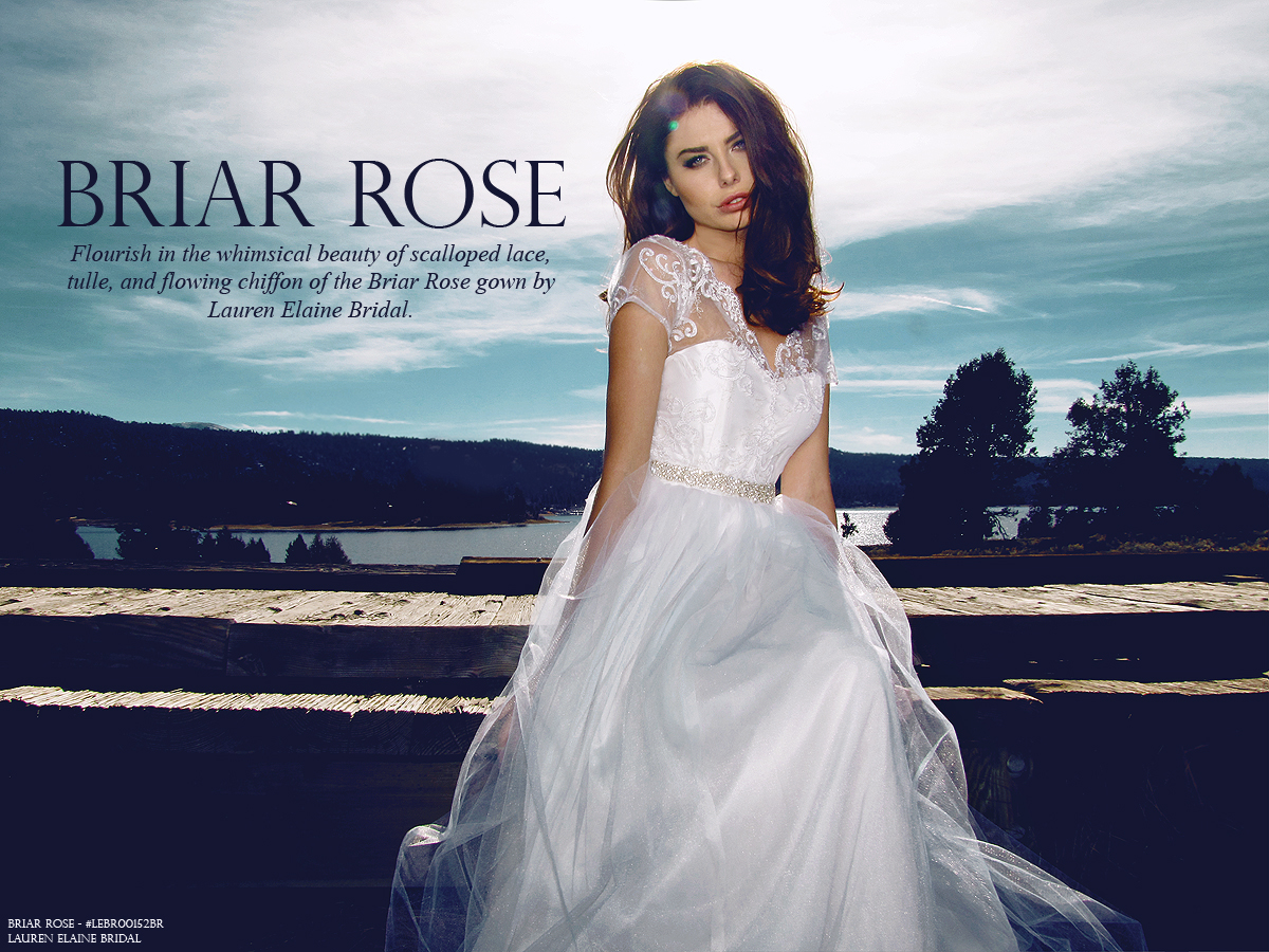 Flourish in the whimsical beauty of scalloped lace, tulle, and flowing chiffon of the Briar Rose gown by Lauren Elaine Bridal. SHOP BRIAR ROSE here.