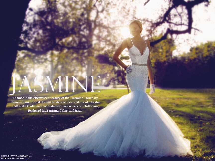 Enamor in the effervescent beauty of the “Jasmine” gown by Lauren Elaine Bridal. Exquisite alencon lace and decadent satin craft a sleek silhouette with dramatic open back and billowing feathered tulle mermaid skirt and train. Shop JASMINE here.