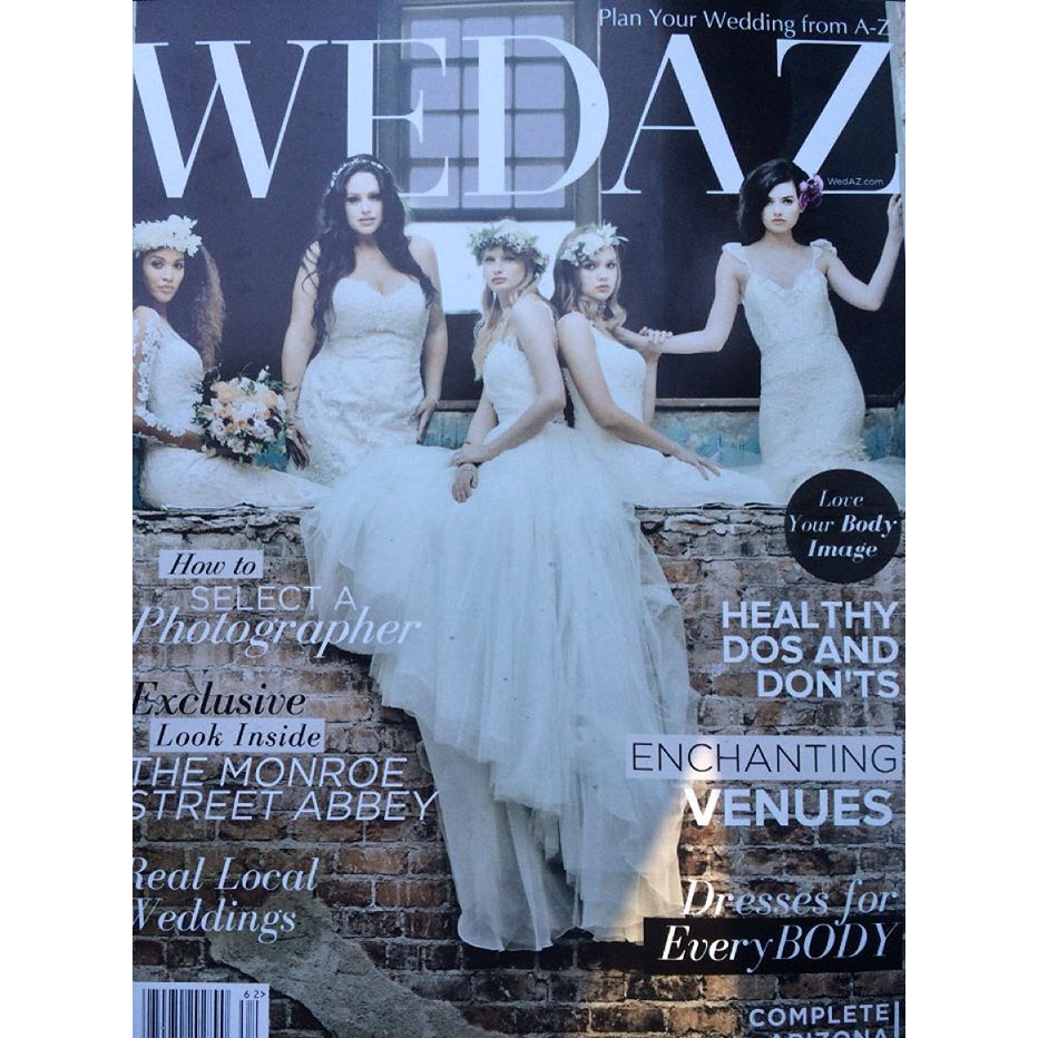 Now on newsstands: Pick up a copy of WedAz Magazine’s latest Spring Issue, featuring Lauren Elaine Bridal on the cover, and an inside 9 page editorial spread! Shot at the historic Monroe Street Abbey in downtown Phoenix, Arizona, this gorgeous editorial features the Lauren Elaine Aurelia and Isla gown styles, as photographed by Phyllis Lane.