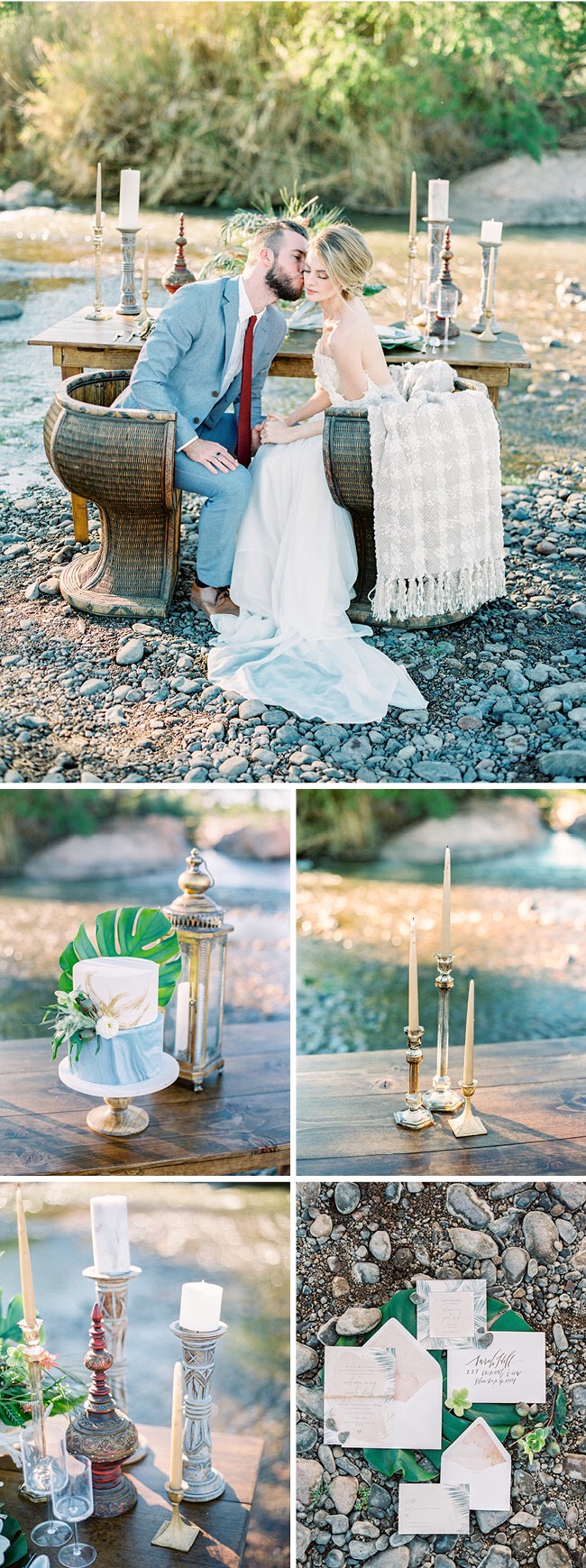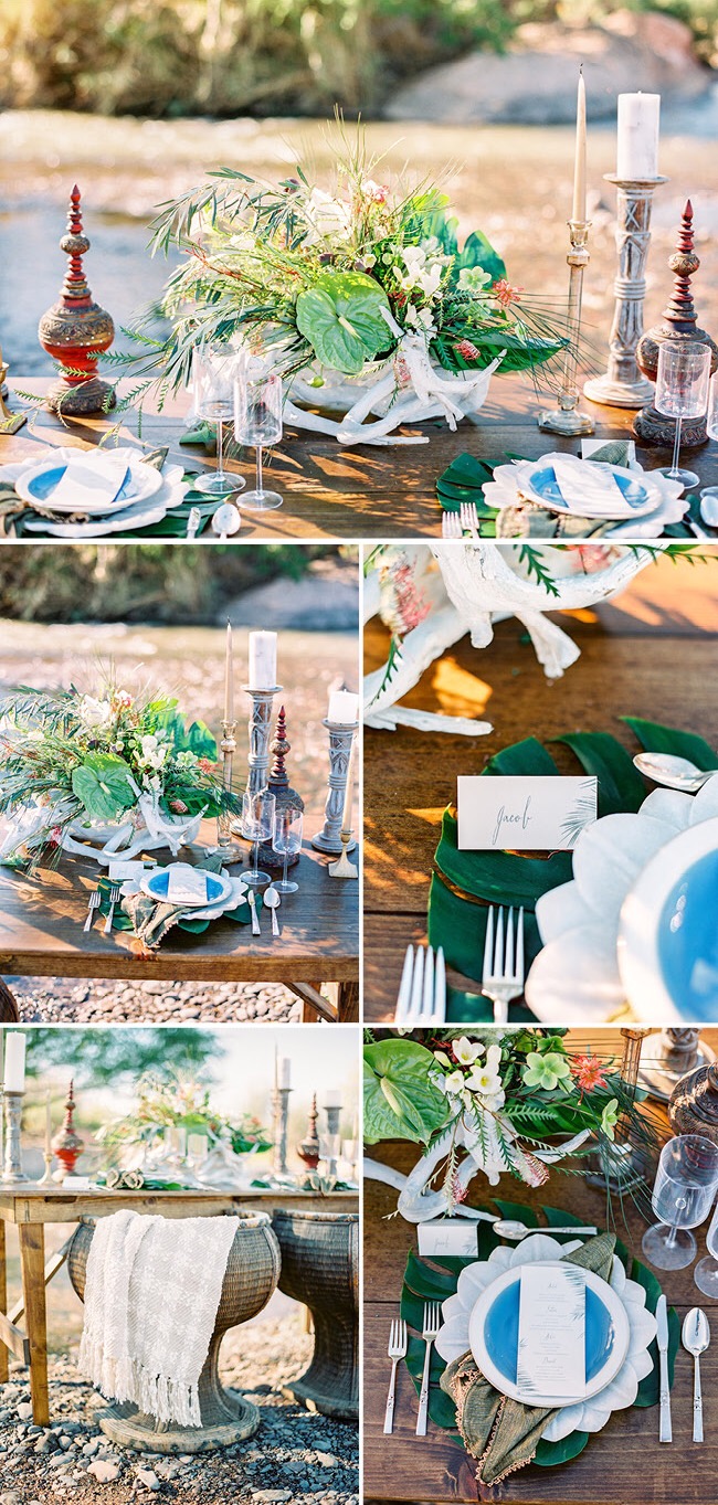 Inspired by Pompeii’s “Where We’re Going We Don’t Need Roads,” Tremaine Ranch styled this shoot focusing on quiet intimate moments between the bride and groom. Vintage lanterns, decorative rugs and the large palm leaves hinted a Moroccan underlay to the design.