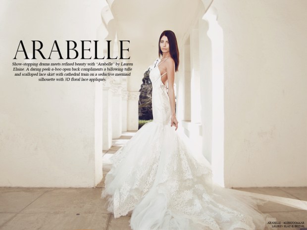 Show-stopping drama meets refined beauty with “Arabelle” by Lauren Elaine. A daring peek-a-boo open back compliments a billowing tulle and scalloped lace skirt with cathedral train on a seductive mermaid silhouette with 3D floral lace appliqués. Shop “ARABELLE” here.