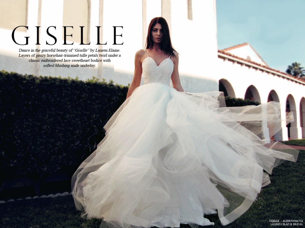 Dance in the graceful beauty of “Giselle” by Lauren Elaine. Layers of gauzy horsehair-trimmed tulle petals twirl under a classic embroidered lace sweetheart bodice with softest blushing nude underlay. Shop “GISELLE” here.