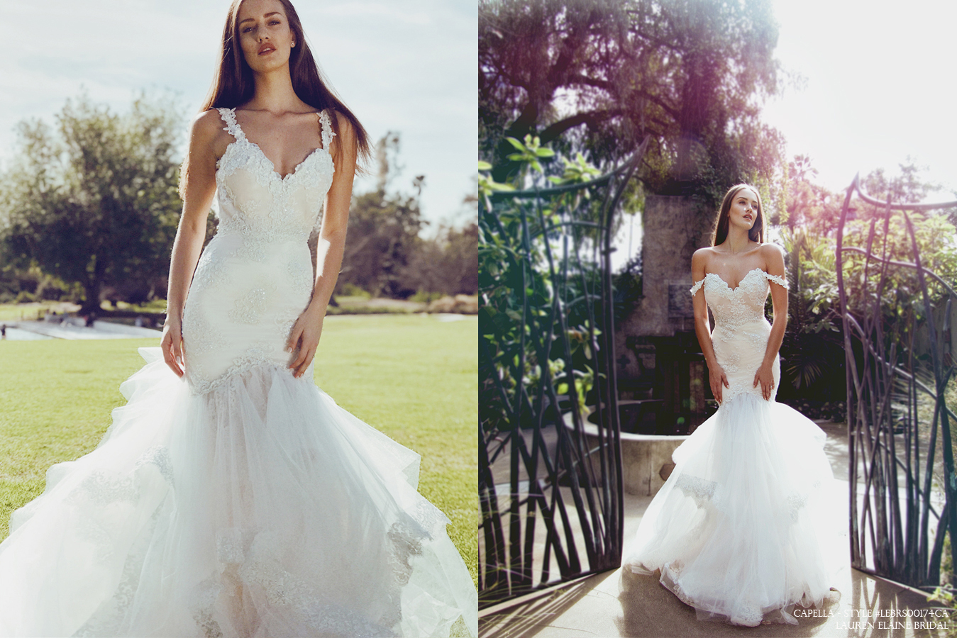 Sparkling from head to toe, “Capella” by Lauren Elaine glistens with exquisite pearl beading, translucent sequins, and silver embroidery detailing with nude illusion underlay on a delicately dramatic mermaid silhouette. SHOP CAPELLA here.