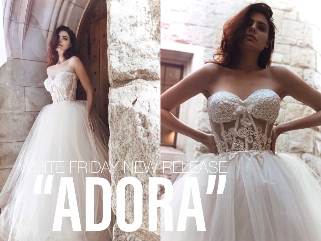 Our ‘White Friday’ new releases continue today with the release of “Adora”! She’s an exquisite strapless bustier illusion sweetheart A-line ball gown with layered tulle skirt and optional detachable cathedral train with optional shoulder bow ties. “Adora” features a detailed bustier style illusion bodice features floral appliqué detailing and decadent pearl and bead work. And due to demand, we’ve extended our trunk show into December! Snag one of our last remaining appointments to fit this beauty, here!