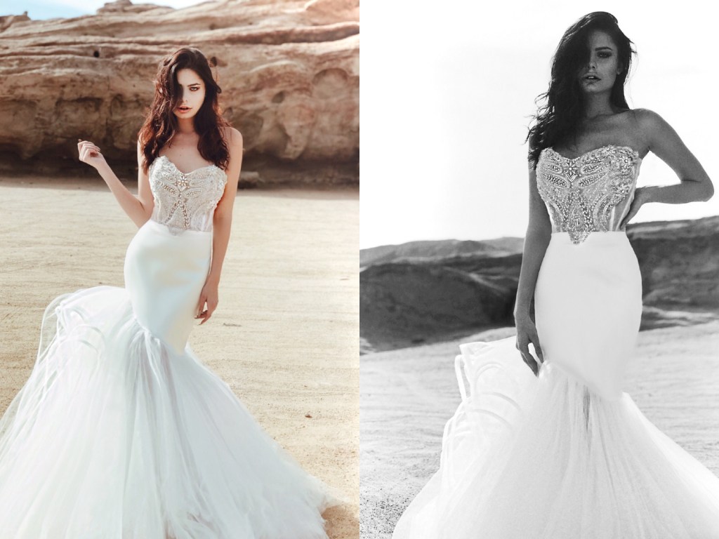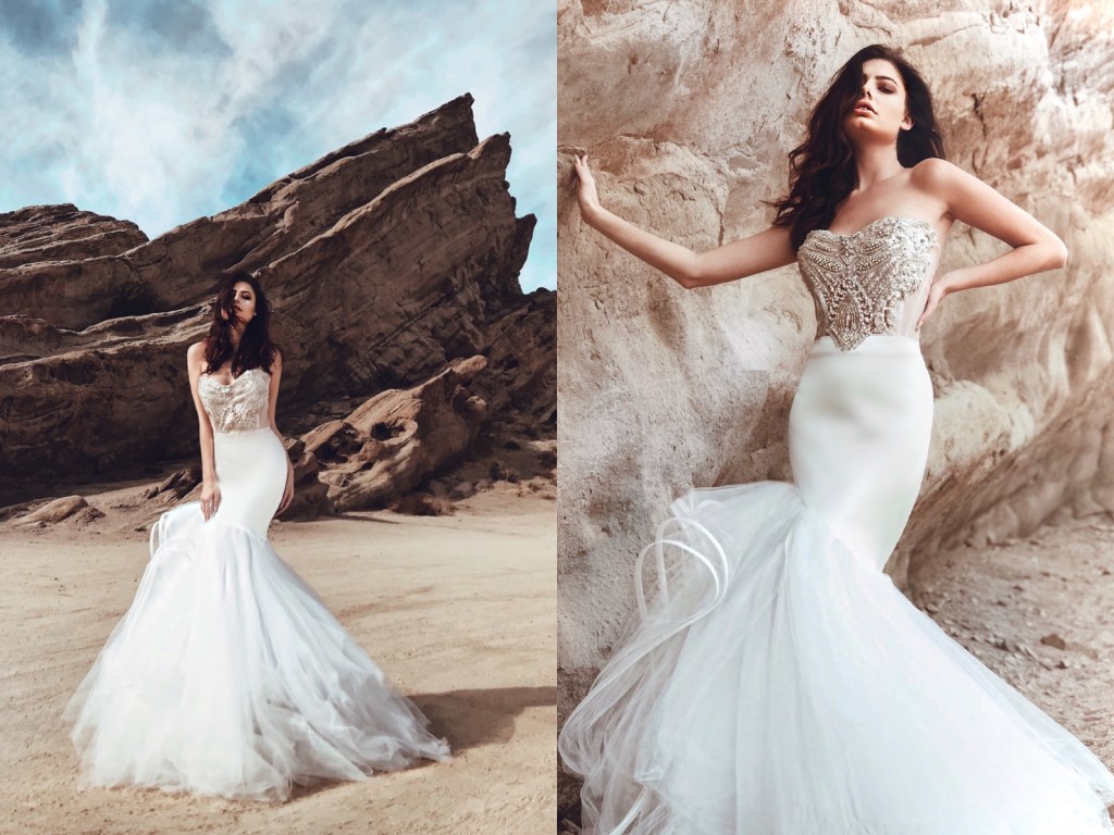 Today’s White Friday new releases continue with “Solstice.” This form-fit beauty’s encrusted with hundreds of crystal rhinestones, silver metallic embroidery, and sparkling beading on a strapless illusion mermaid silhouette with Italian satin hips and modern asymmetrical thigh line cut with feathered tulle skirt and horsehair petal detailing. SHOP SOLSTICE here!