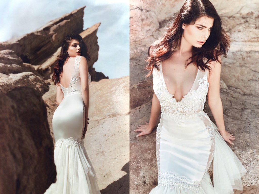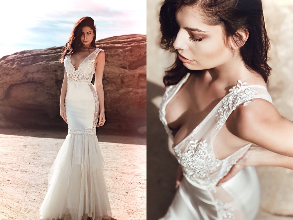 Introducing our last White Friday new release, “Incandessa!” She’s a sparkling deep-V lace illusion mermaid wedding dress silhouette with sparkling bead and pearl detail appliqués and sleek Italian satin hips. “Incandessa’s” romantic tiered nette skirt features exquisite sparkle lace floral scallop detailing with flowing detachable cathedral train. SHOP “INCANDESSA” here!